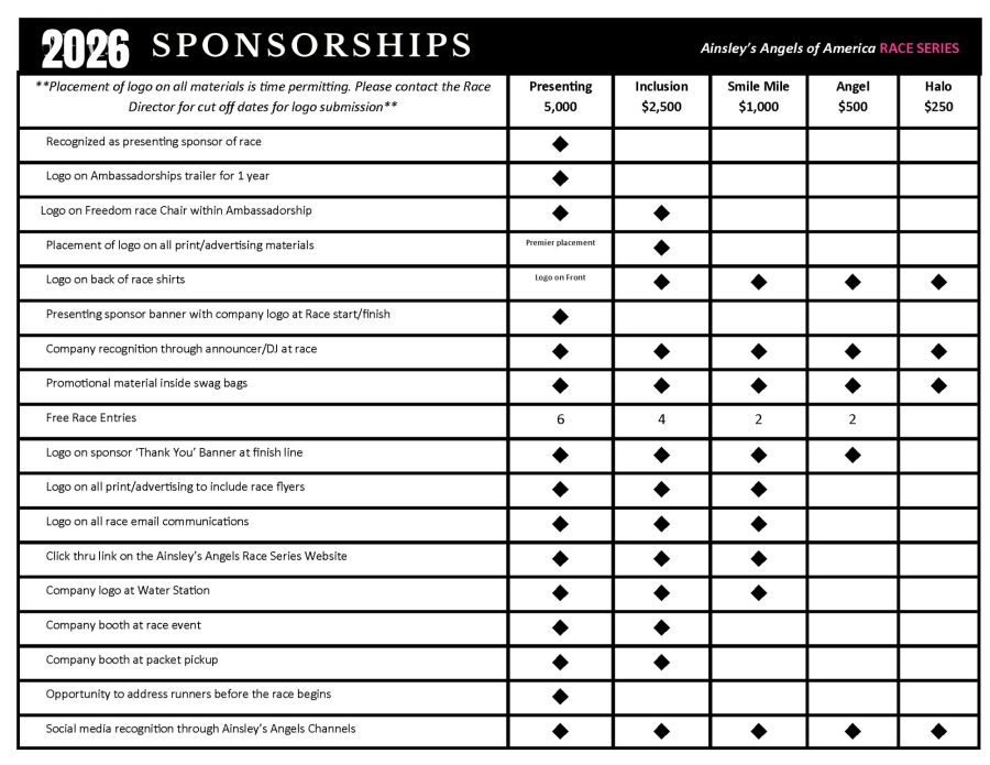 Become a race sponsor and receive benefits such as your business logo on shirts/emails/websites, free race entries and informational tables at our race. Please see the chart below for details on each level.