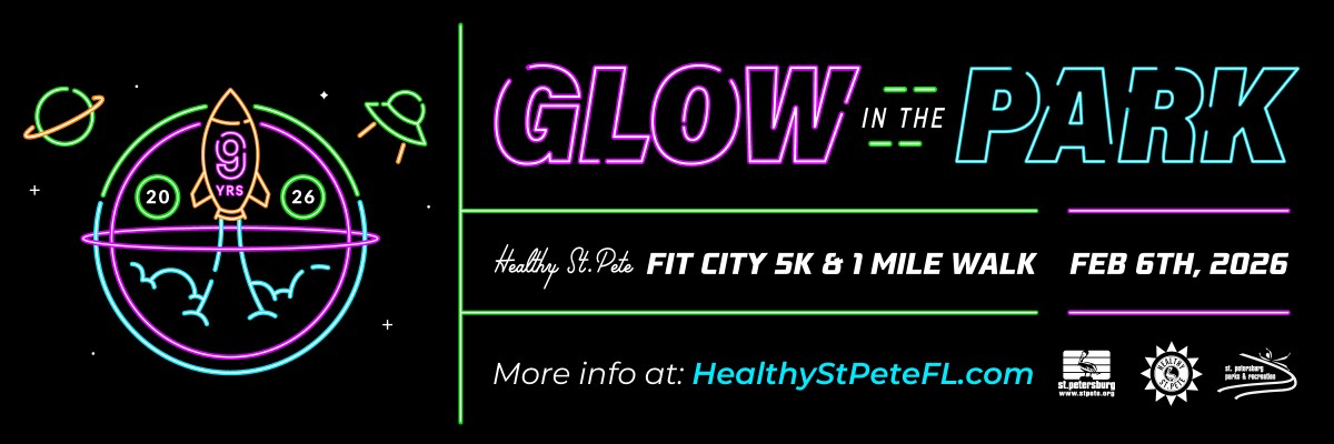 Healthy St. Pete is a division of the St. Petersburg Parks & Recreation Department. The mission of Healthy St. Pete is to build a culture of health in our city by making the healthy choice the easy choice through a collaborative community effort. Join us as we GLOW IN THE PARK with great music, fun glow games, a vendor village, and much more! Be sure to wear your favorite GLOW costumes to shine for health! Limited scholarships are available for race registration. Contact Rhenelle McSween-Navarro, Healthy St. Pete Supervisor, at rhenelle.mcsween-navarro@stpete.org for more information. To learn more about Fit City, contact Healthy St. Pete at 727-893-7494 or visit healthystpetefl.com.