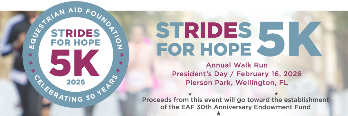 Join us on February 16, 2026 (President's Day) for the fifth anniversary of the Equestrian Aid Foundation's STRIDES FOR HOPE 5K Walk/Run: the most fun you can have to benefit the serious cause of helping equestrians through medical catastrophes and other unexpected crises.