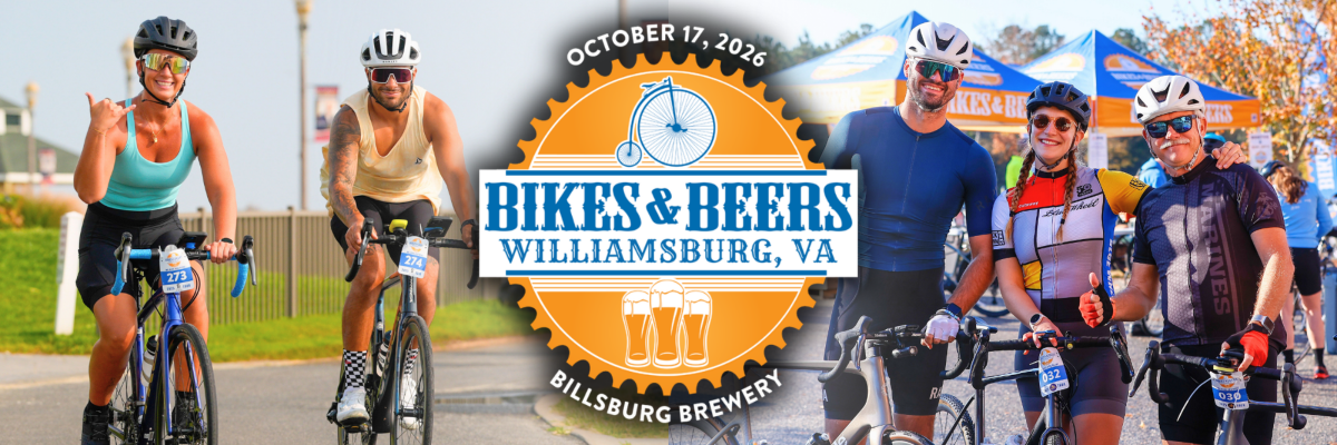 Register for Virginia's 4th Annual Bikes & Beers Williamsburg - Bike Ride & Beer Festival 2026, the premier cycling event series departing from BILLSBURG BREWING in Williamsburg, VA! Choose your challenge from a 15, 30, or 45-mile ride through the beautiful areas of trail and less-traveled roads of Williamsburg. Complete with morning fuel stations, fully marked routes, rest stops, and SAG support for all riding levels. Finish back at BILLSBURG for an unforgettable post-ride beer festival atmosphere, where you'll enjoy two complimentary craft beers in an official B&B pint glass, live music, food trucks, games, sponsor giveaways, and a massive charity raffle with over $3,000 in prizes, all while benefiting local cycling charities. Have fun and give back!
