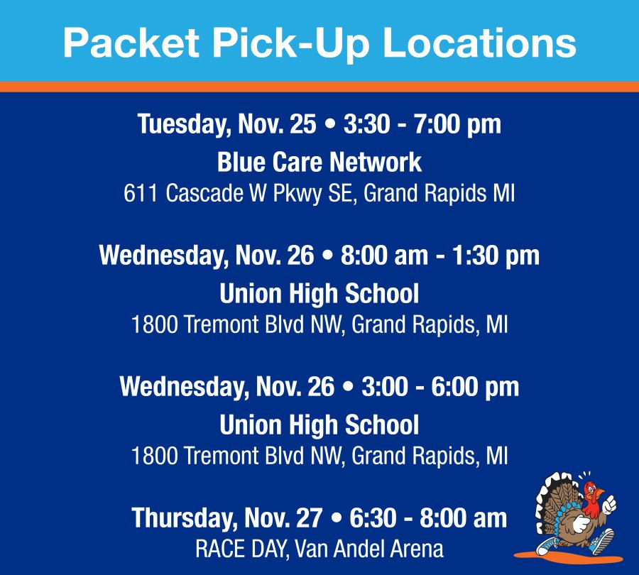 A. There will be a number of locations and opportunities to retrieve your packet, including on Race Day at Van Andel Arena. View the graphic above listing packet pick-up locations, dates and times!