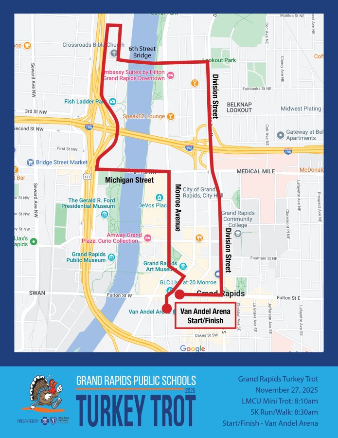 Join us on November 27, 2025 (Thanksgiving Day) for the 33rd Annual Grand Rapids Turkey Trot! Proceeds from the race help to offset the cost of Grand Rapids Public Schools athletics so that all students have the opportunity to participate.
